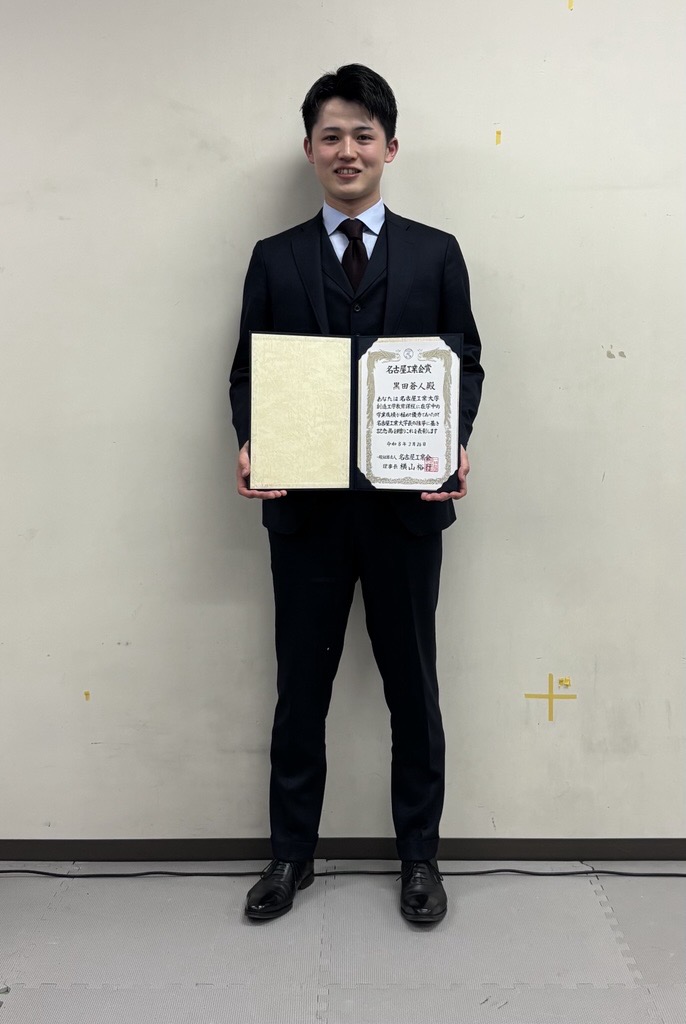 学業成績が極めて優秀であった学生に贈られる名古屋工業会賞をB4の黒田さん(創造工学教育課程)が受賞しました。